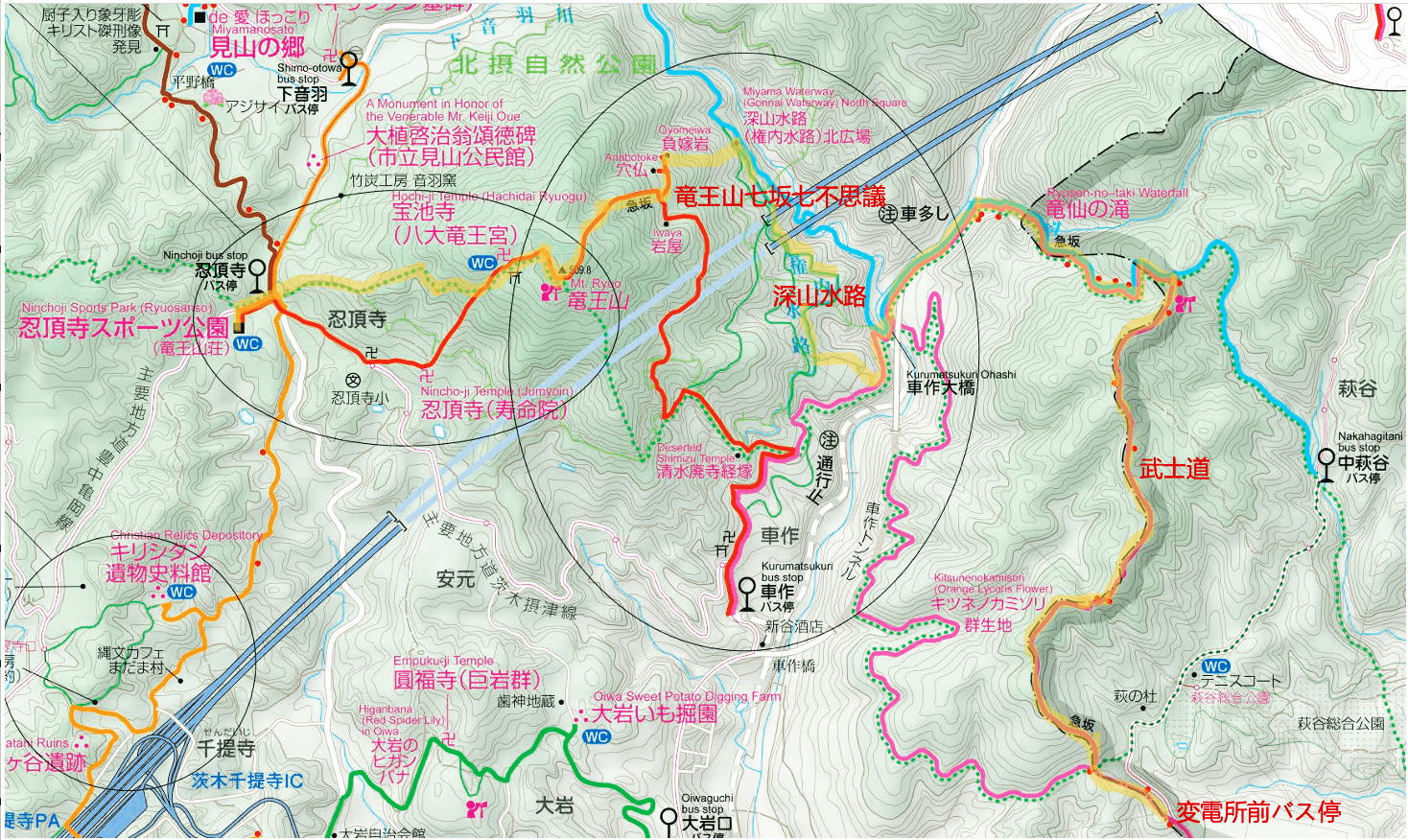 - 帰路(参考):16:37 忍頂寺バス停~17:20頃 JR茨木駅着、17:30頃 阪急茨木市駅着(670円)