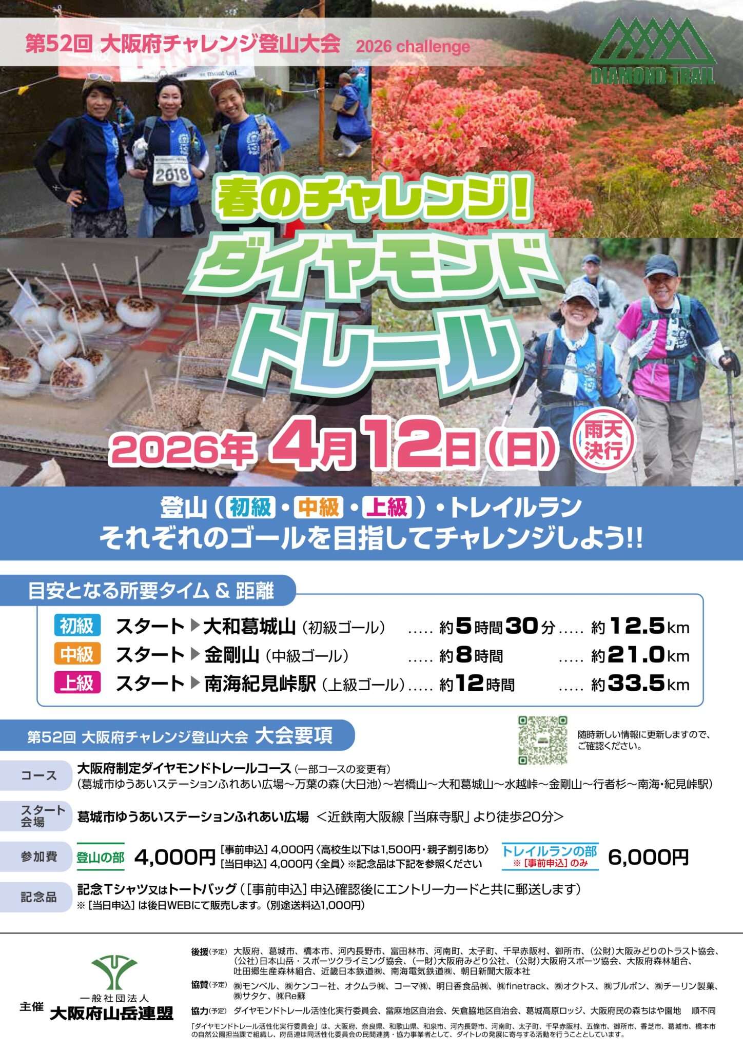 春の到来を告げる「大阪府チャレンジ登山大会〈チャレンジダイトレ〉」2026年第52回大会の受付を開始しました!